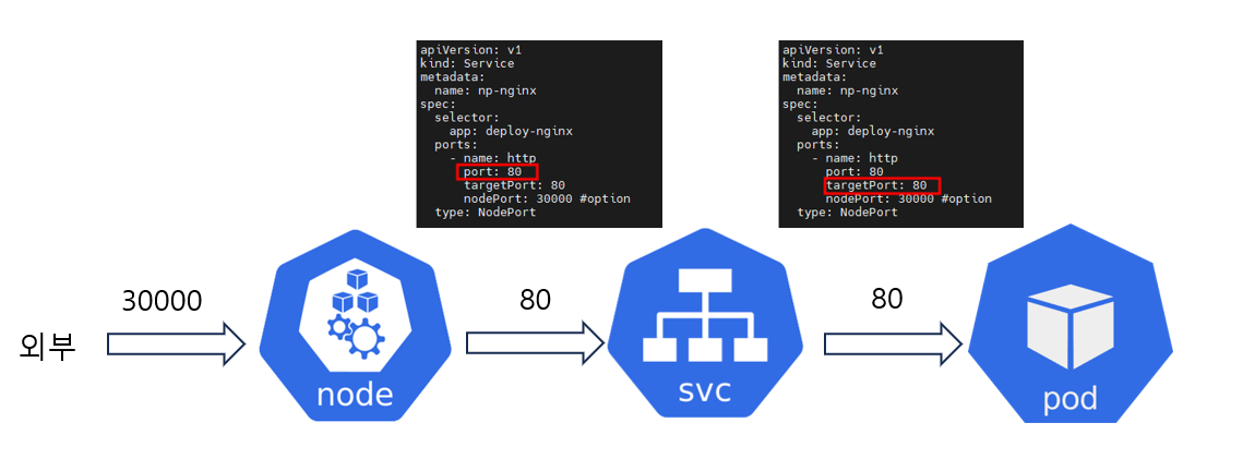 모든 워커 노드의 특정 포트를 열고 모든 요청을 노드포트 서비스로 전달
