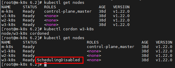 노드를 확인해 보면 SehedulingDisabled 스케쥴링에서 제외된걸 볼 수 있다.