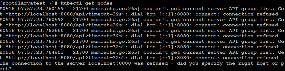 E0518 07:57:23.760159 21700 memcache.go:265] couldn't get current server API group list: Get "http://localhost:8080/api?timeout=32s": dial tcp [::1]:8080: connect: connection refused