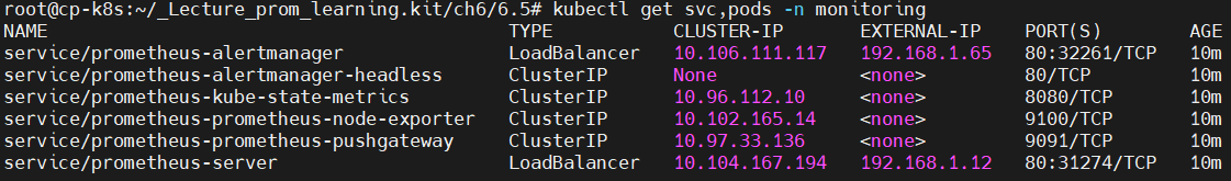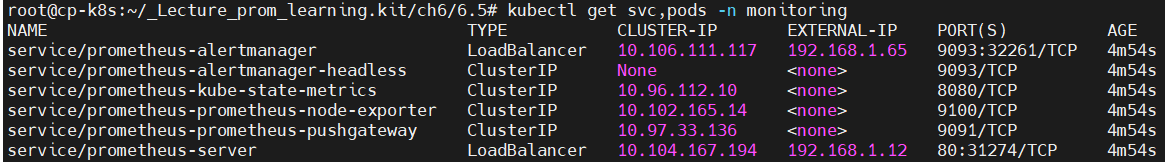 service/prometheus-alertmanager LoadBalancer 10.106.111.117 192.168.1.65 9093:32261/TCP 4m54s 으로 올라와버림