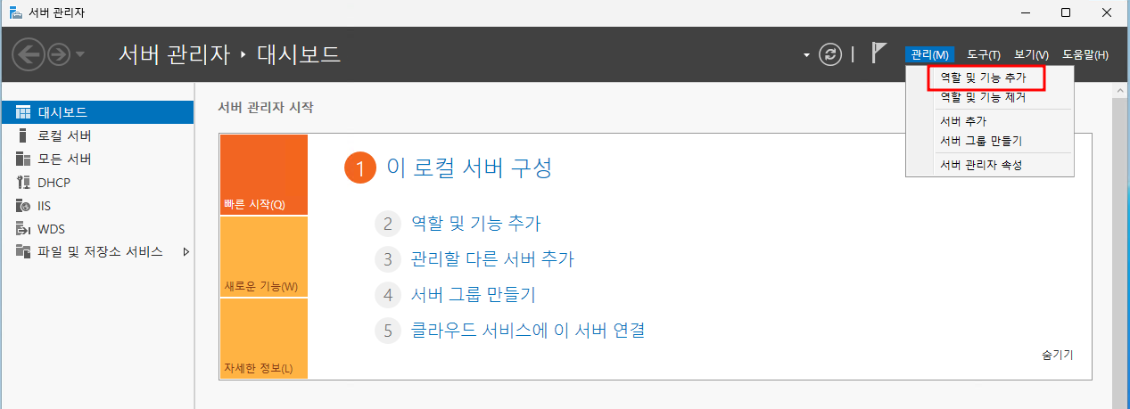 서버관리자 > 역할 및 기능 추가를 클릭하여 들어간다.