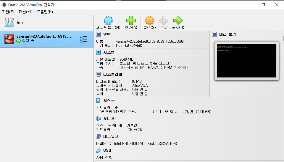 vagrant가 VirtualBox에 들어가 있는것을 확인 할 수 있다.